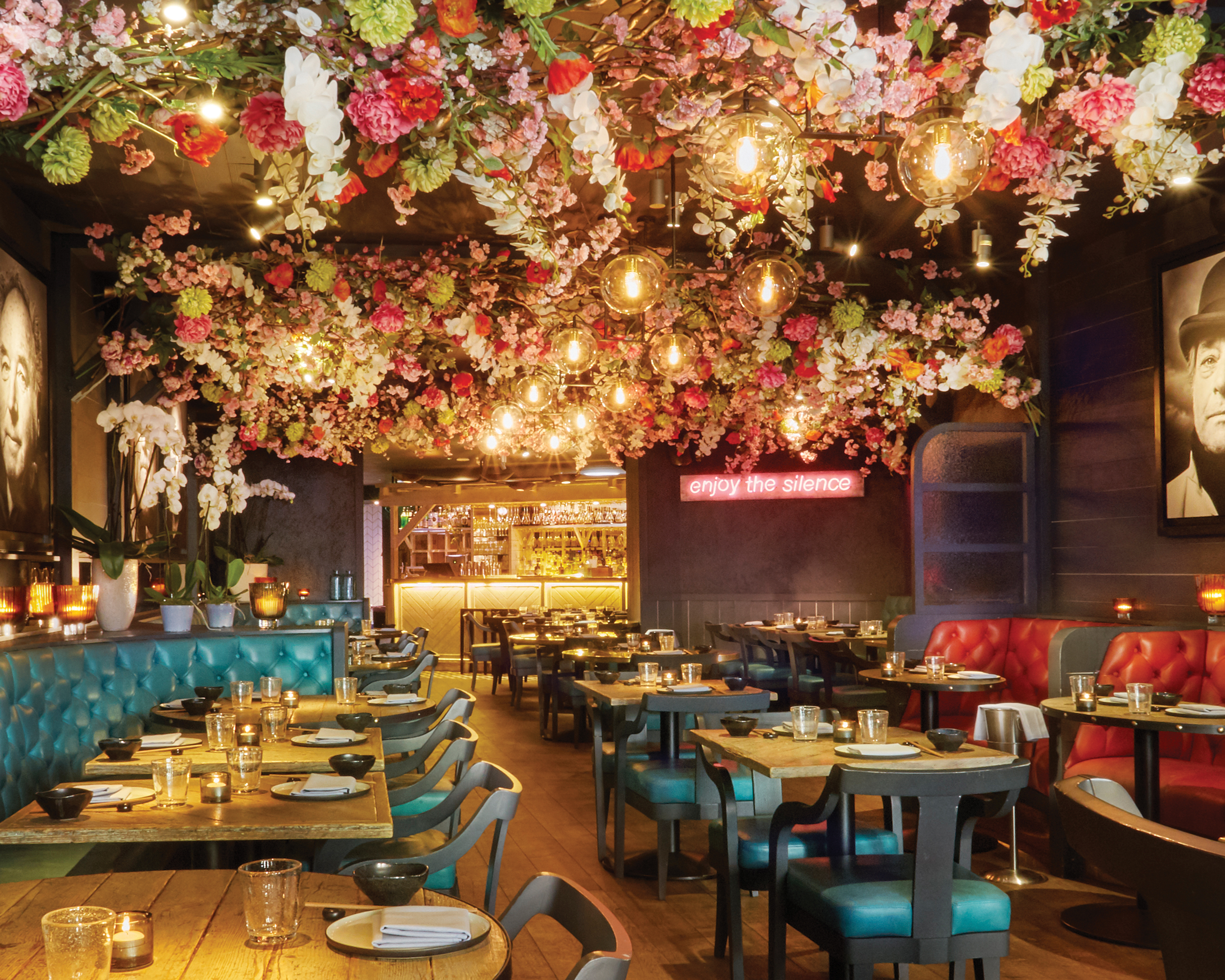 You’ll spot the poke bar before you’ve even got through the door, they keep the fish on ice in the window of the restaurant, which is enough to tempt anyone in. Out back you’ll find the golden lit bar and in between the two is the dark, sexy dining room, adorned with faux flowers hanging from the ceiling and a pink neon sign telling us to ‘enjoy the silence’. We took a seat on the green leather banquette, and noticed that they have indeed turned the music down a touch since we last visited (which is definitely a good move).