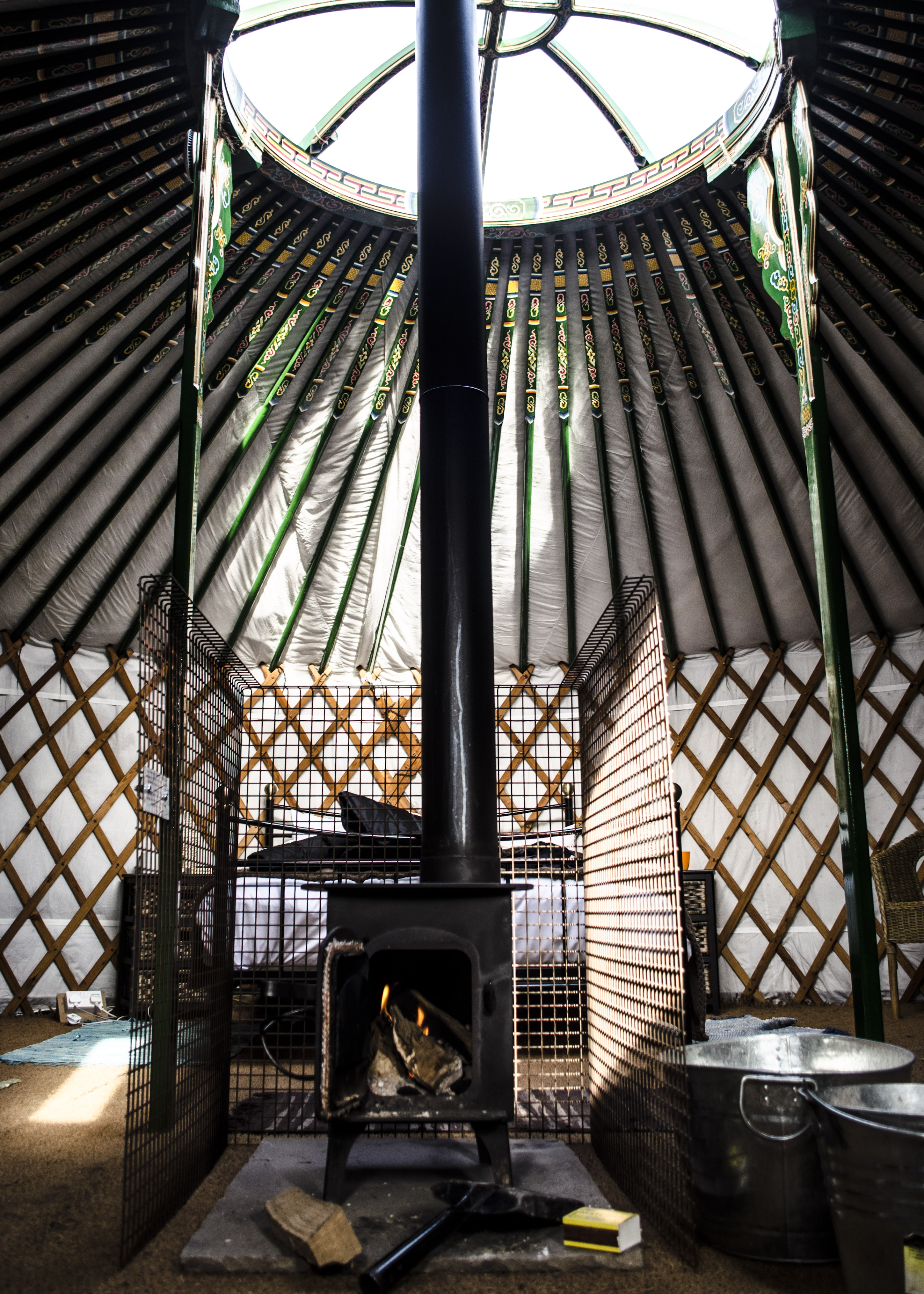 There are six traditional Mongolian yurts in total, each one beautifully hand painted and named after wildflowers. Step inside the tiny hobbit door and you’ll find a double bed, made up with the crispest of white sheets (better than some hotels we’ve stayed at in fact!) and the softest throw. There were also two large single day beds (perfect for kids) – apparently each yurt can sleep up to six but we’d say a comfortable four. Of course, each yurt revolves around a central wood burner which keeps everything super toasty. Mark had kindly got this going for us so we had the warmest of welcomes. Oh and there’s also electricity! Because as nice as it is to ‘get away from it all’ we have an Instagram addiction and we do need our morning cuppa brought to us in bed before we can fully function.