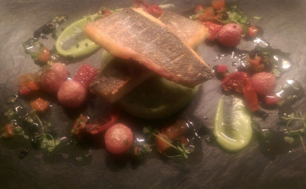 Seared Sea bass, Deep Fried Oyster, Pickled Cucumber, Squid ink Pearls,