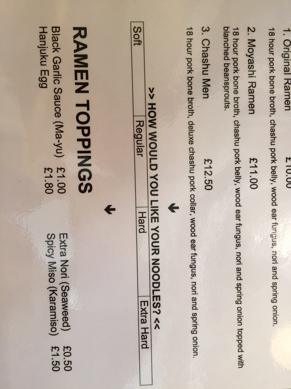 No gimmicks here, just a simple menu of three types of ramen dish; Original, Moyashi and Chasiu men, starting from £10 up to £12.50. The toppings are just as straight forward with a choice of three as well as the options of extra nori and extra noodles.