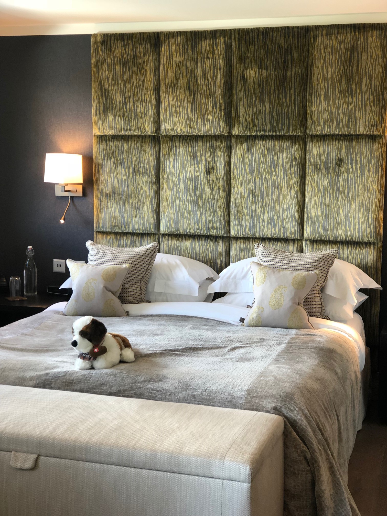 Upstairs our dog is waiting for us, a giant Toblerone at his feet. Why leave a couple of half-arsed truffles on our pillow when you can have a midnight feast of the legendary Swiss chocolate? Quite. A note says he’ll top us up if we manage to get through the whole bar during our stay but given we’re only here for two nights, I rather hope we don’t.